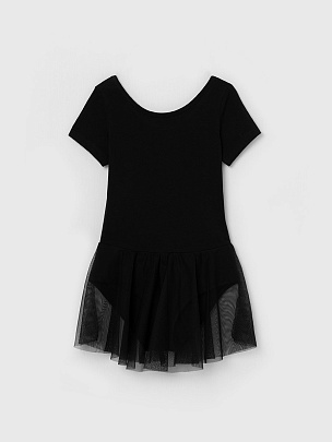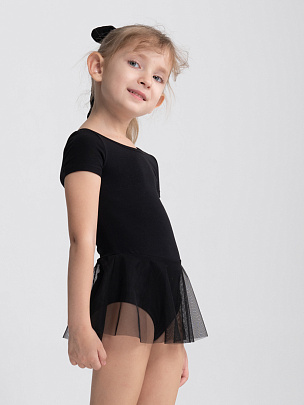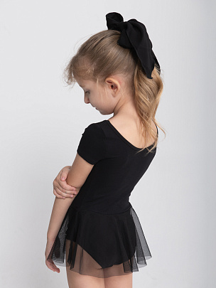 Купальник гимнастический с коротким рукавом и с юбкой из сетки в цвет основного полотна. Вырез горловины и проймы ножек окантованы бейкой из основного полотна.