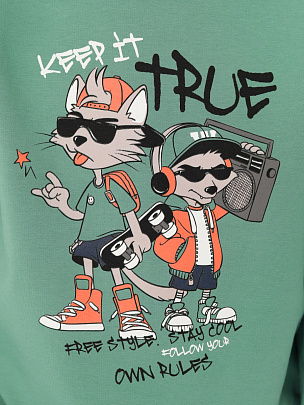 Джемпер с длинными рукавами и притачным поясом. Рукава втачные с манжетами по низу. Воротник, манжеты и пояс выполнены из полотна с эластаном. Перед и спинка декорированы принтом "Оставайся хладнокровным, следуй своим собственным правилам".