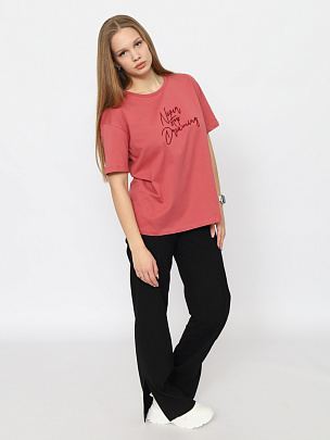 Футболка прямого силуэта длиной по линию бедер. Короткий рукав. Круглая горловина обработана узкой притачной обтачкой из рибаны с эластаном. Полочка декорирована вышивкой "никогда не переставай мечтать".