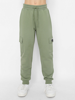 Брюки с притачным поясом и манжетами. В пояс вставлена резинка и функциональный шнур. Пояс и манжеты выполнены из полотна с эластаном. В боковой части брюк располагаются карманы. На передней части в области колена расположен декоративный подрез. На задней части брюк расположена декоративная вставка контрастного цвета. Карман декорирован вязаной нашивкой.