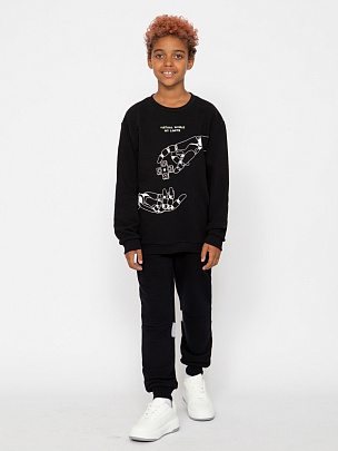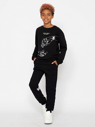 Брюки с притачным поясом и манжетами. В пояс вставлена резинка и функциональный шнур. Пояс и манжеты выполнены из полотна с эластаном. В боковой части брюк располагаются карманы. На передней части в области колена расположен декоративный подрез. На задней части брюк расположена декоративная вставка контрастного цвета. Карман декорирован вязаной нашивкой.