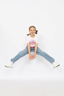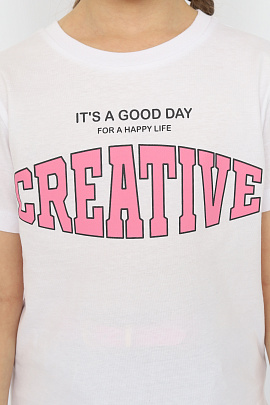 Футболка с коротким рукавом. Горловина круглая, обработана узким воротником из полотна с эластаном. Перед оформлен шрифтовым принтом.