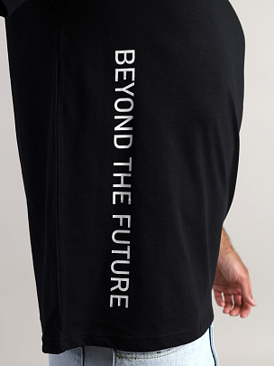 Футболка oversize со спущенным плечом, с коротким рукавом. Горловина круглая, обработана притачной бейкой из рибаны с лакрой. Плечевые швы смещены на перед и отстрочены. По переду вдоль правого бокового шва - текстовый принт.